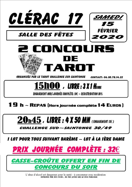 Coût de la participation : 10€ CONCOURS DE L'APRÈS-MIDI; SOIR 13€; REPAS 14€; 32€ JOURNÉE COMPLÈTE