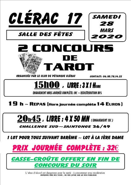 Coût de la participation : 10€ CONCOURS DE L'APRÈS-MIDI; SOIR 13€; REPAS 14€; 32€ JOURNÉE COMPLÈTE